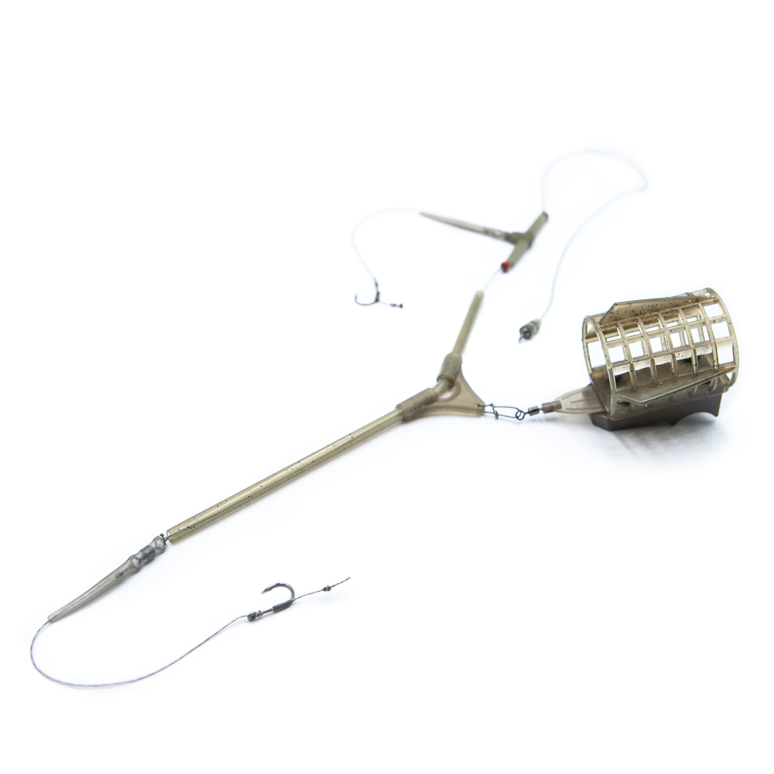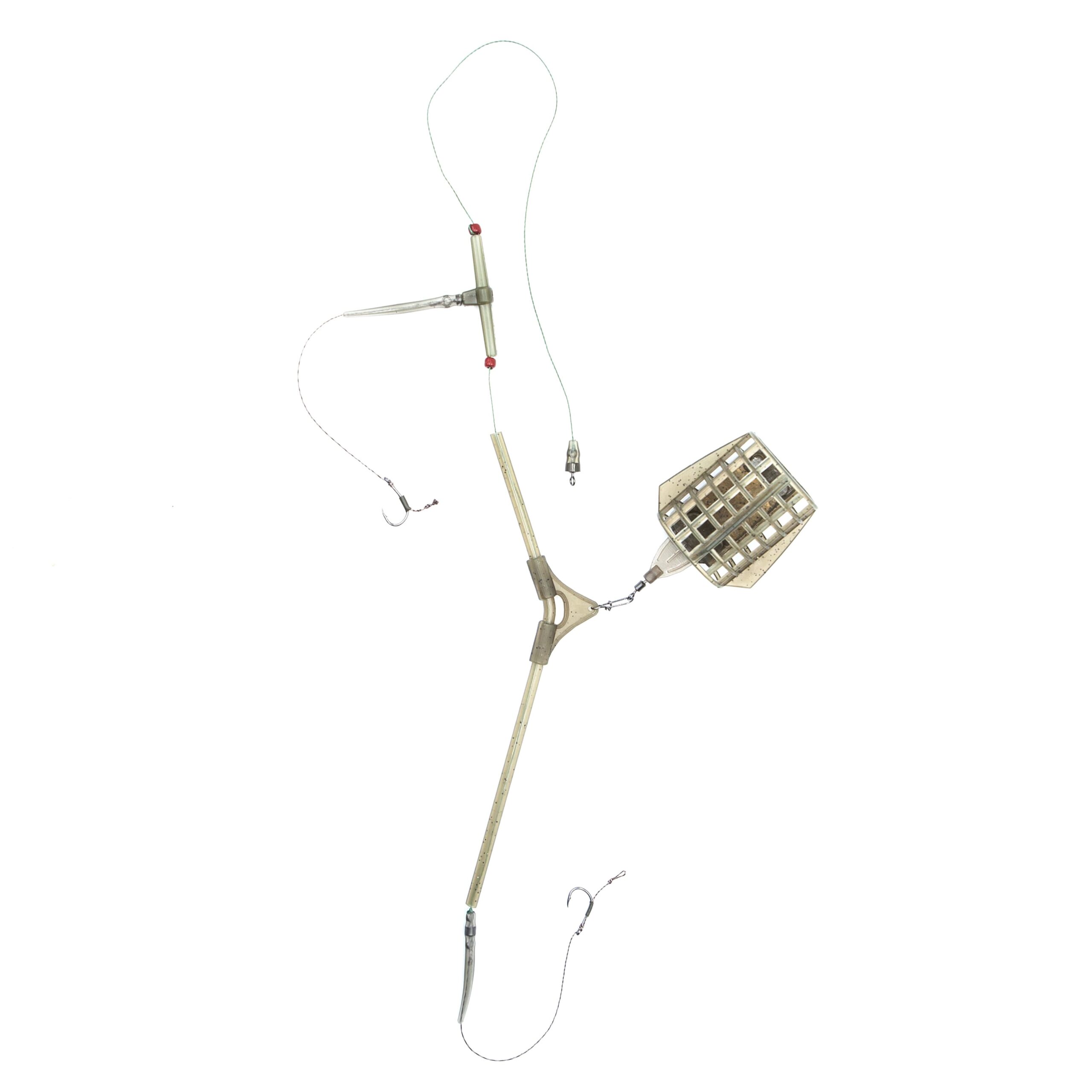 Грузило годівниці оснащене ґрунтозачепами, що надійно утримують снасть на дні навіть за помірної течії. Два гачки забезпечують підвищену результативність ловлі — можна використовувати різні типи насадок або експериментувати з подачею приманки.